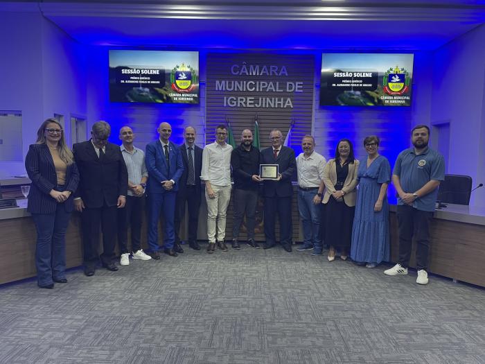 Pela primeira vez, a Câmara de Vereadores de Igrejinha realizou a entrega do Prêmio Jurídico Alexandre Fidelis de Araújo, honraria criada para destacar personalidades de destaque no campo do Direito. O primeiro agraciado foi o advogado Dr. Clóvis Claunir Werb, reconhecido por sua trajetória admirável na advocacia e por sua atuação voluntária em diversas entidades e associações, além de sua participação na vida política igrejinhense. A Sessão Solene ocorreu na terça-feira (4), contando com a presença dos vereadores, do prefeito Leandro Hörlle e do vice-prefeito Juliano Müller de Oliveira.