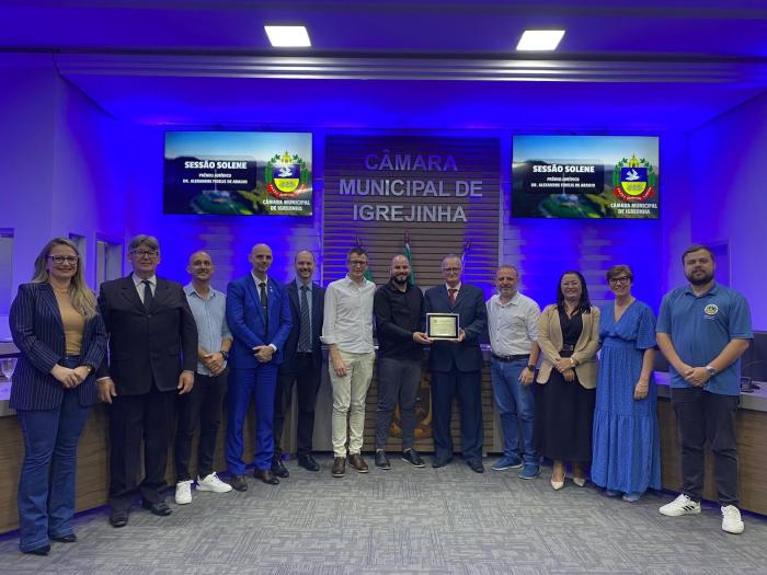 Pela primeira vez, a Câmara de Vereadores de Igrejinha realizou a entrega do Prêmio Jurídico Alexandre Fidelis de Araújo, honraria criada para destacar personalidades de destaque no campo do Direito. O primeiro agraciado foi o advogado Dr. Clóvis Claunir Werb, reconhecido por sua trajetória admirável na advocacia e por sua atuação voluntária em diversas entidades e associações, além de sua participação na vida política igrejinhense. A Sessão Solene ocorreu na terça-feira (4), contando com a presença dos vereadores, do prefeito Leandro Hörlle e do vice-prefeito Juliano Müller de Oliveira.